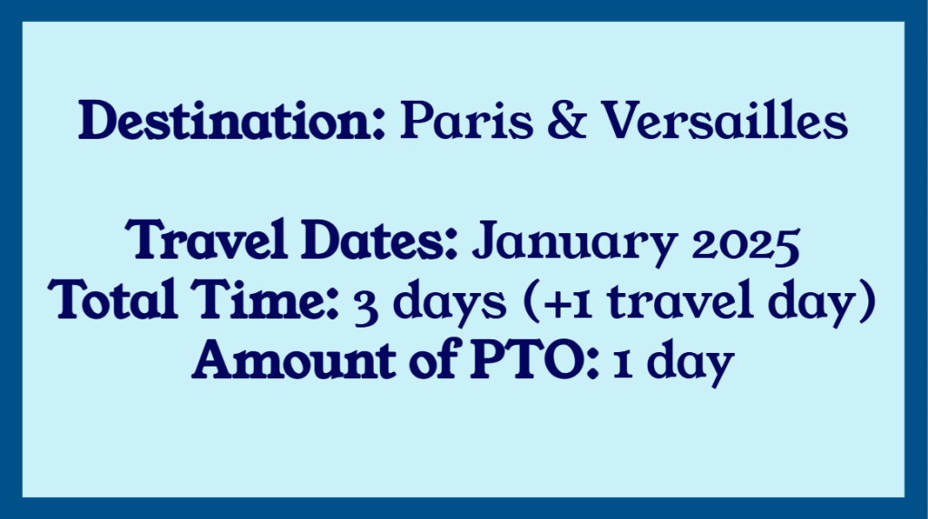 In December of last year, my boyfriend and I decided to use the MLK Day holiday to travel. Then we decided to test out just how ambitious we could be in our travels. We set out to see if we could explore an entire city in 3 days (with only 1 day of PTO!) without burning ourselves out or feeling dissatisfied with the trip. We climbed the Eiffel Tower, we saw more of the Louvre and Versailles, and we explored all we could explore. It was a challenge for sure and we learned a ton along the way, but it was 100% worth it!